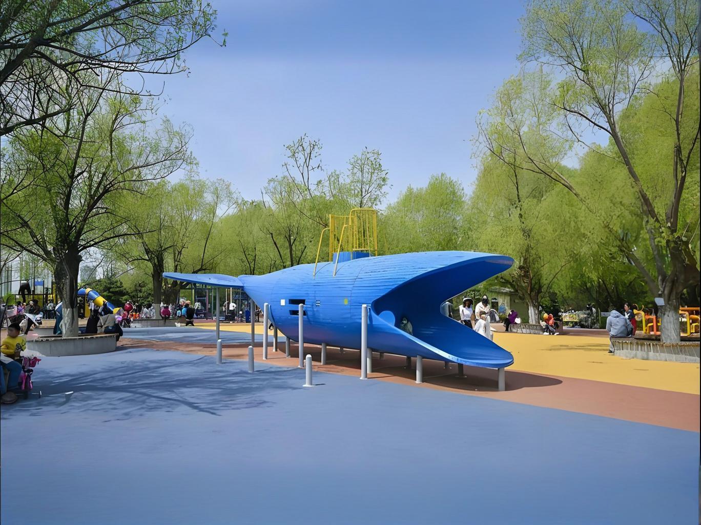 游乐设施采用圆角防撞设计,地面铺设缓冲材质(如沙池、EPDM),攀爬区设置防坠网;