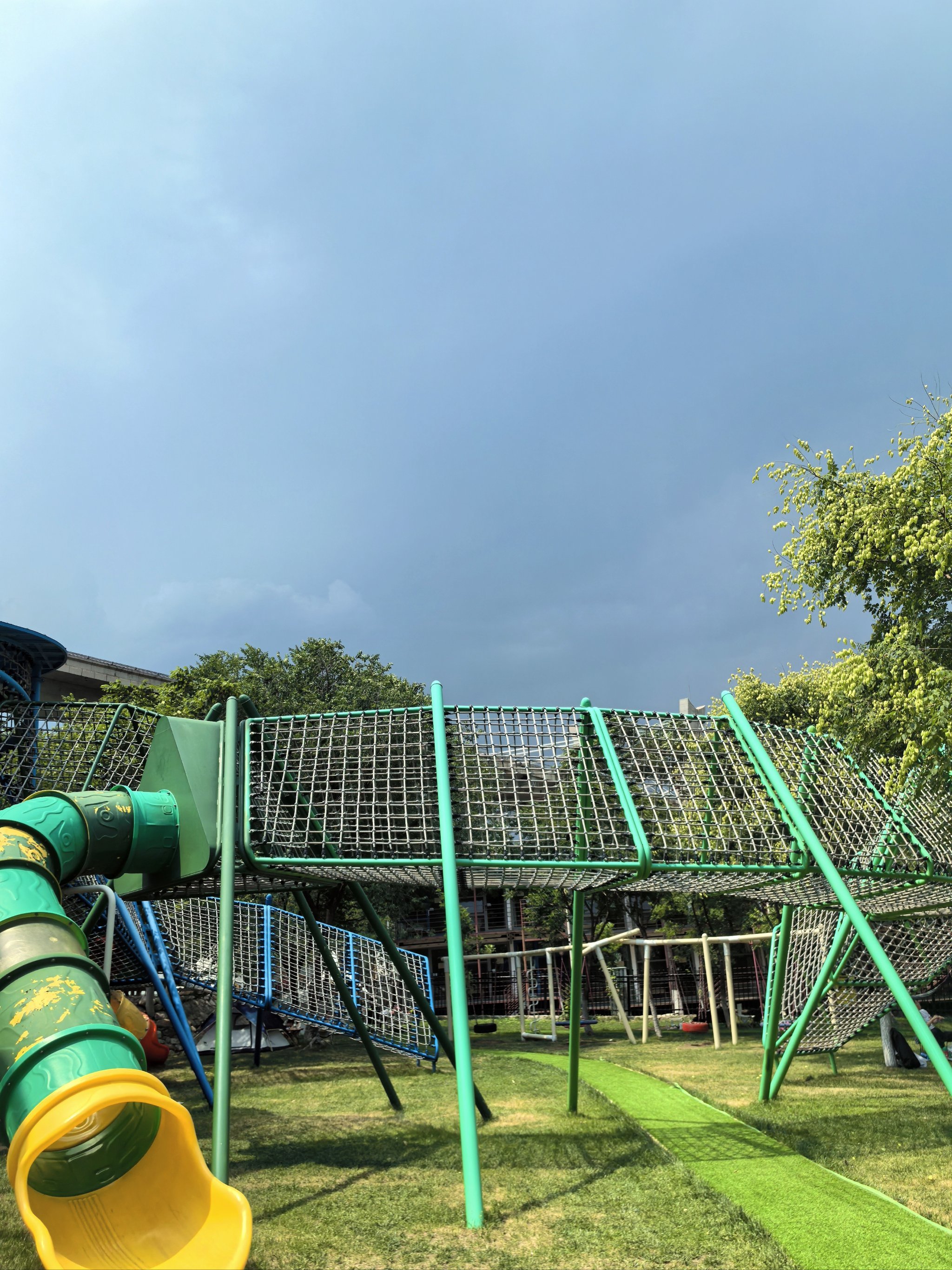 蹦床与秋千:分散布局于树荫下,兼顾安全性与趣味性。